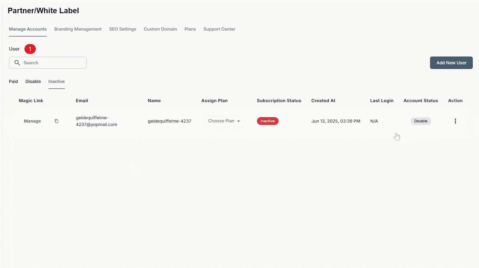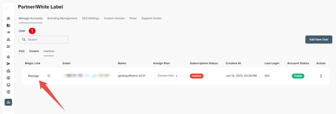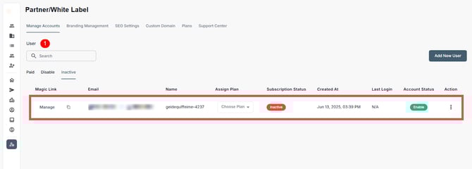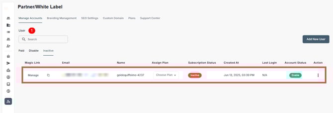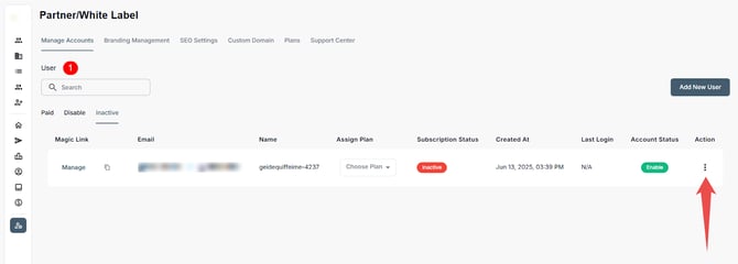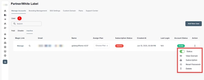 Administrators in the Partner/White Label portal can add/invite new users, assign subscription plans, monitor activity, and manage account access from a centralized dashboard. This includes onboarding users as well as performing key actions like enabling or disabling accounts, resetting passwords, and removing users to ensure appropriate access and alignment with operational needs.