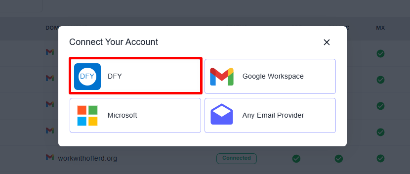 A modal window titled "Connect Your Account" will appear, where you can select DFY as the email service provider.
