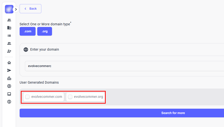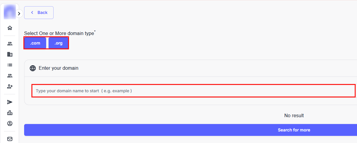 Step 6: Select your preferred domain type (.com or .org), and enter your domain name or relevant keywords in the search field.