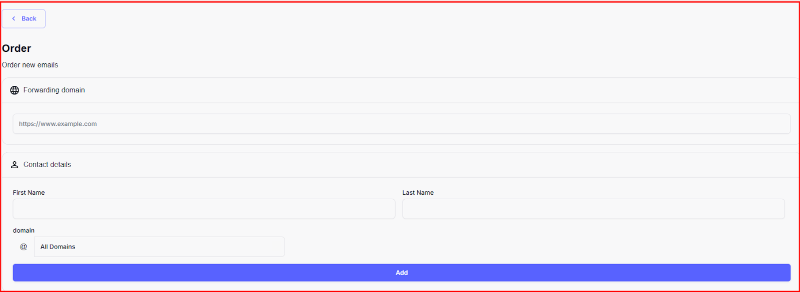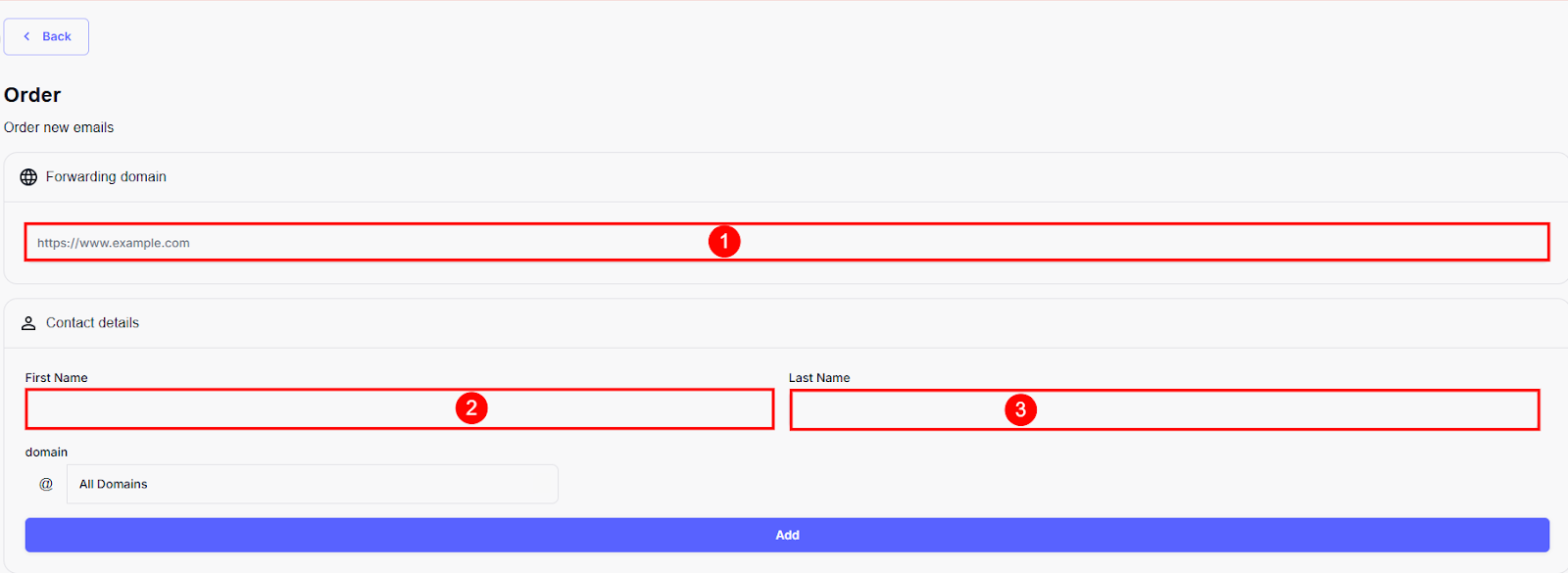 Step 11: Once you've filled in the details, click the Add button and Place Order to add the domain to the order.