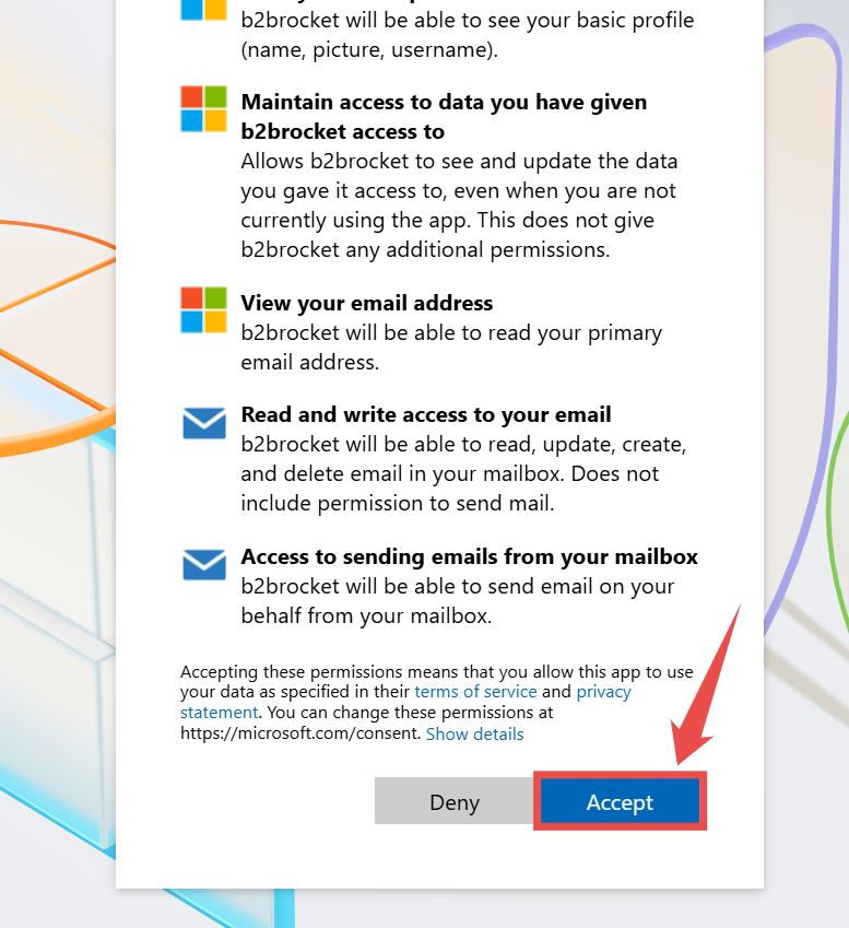 Step 7: Review the permissions requested by the platform and click Accept to grant access and complete the account integration.