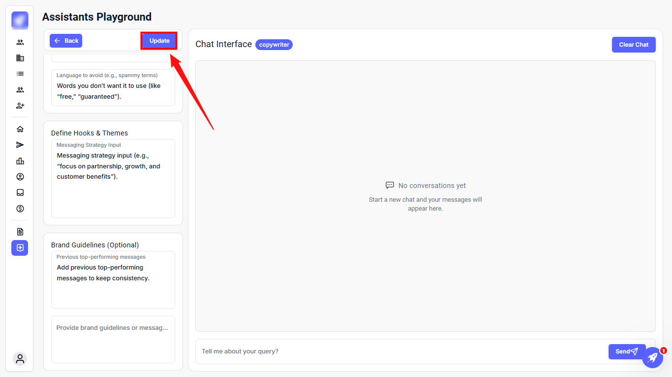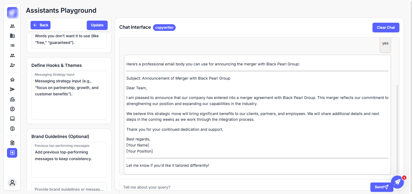 Step 3: In the chat box, type the message request or prompt you want the Copywriter to generate. Then click Send.