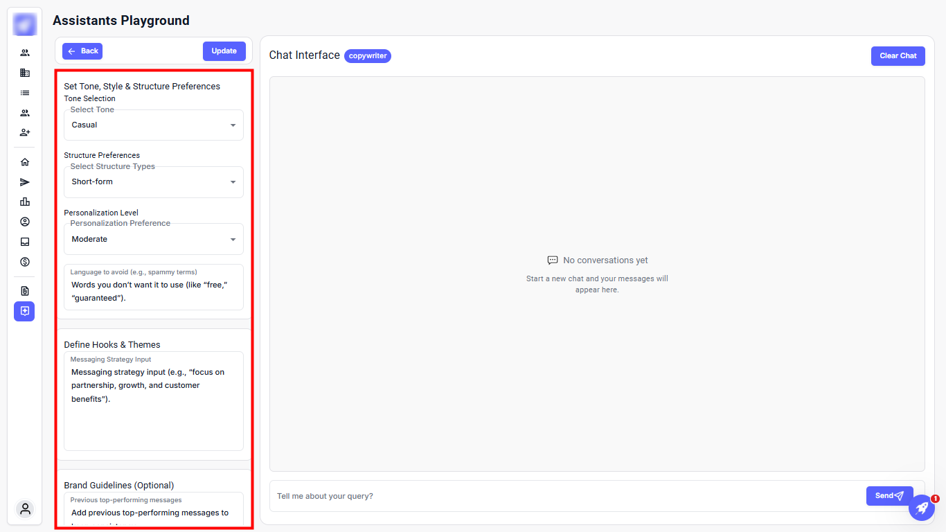 Step 1: Go to the Copywriter agent and adjust the preferences in the left panel to guide the Copywriter’s output.