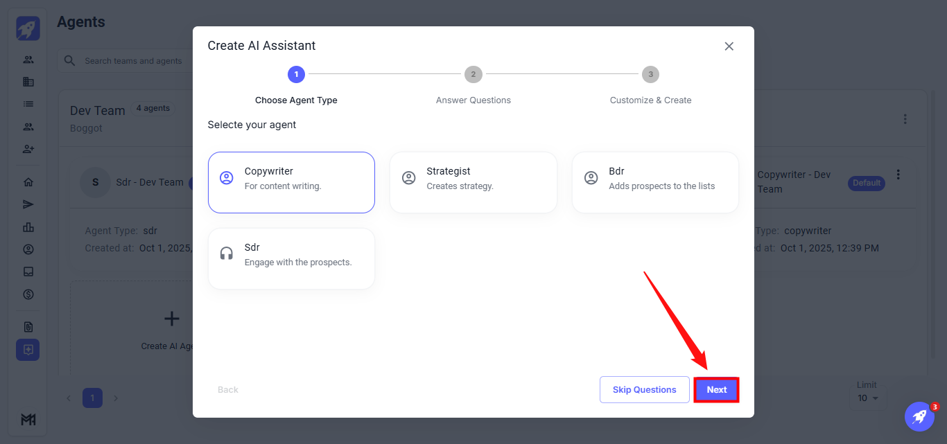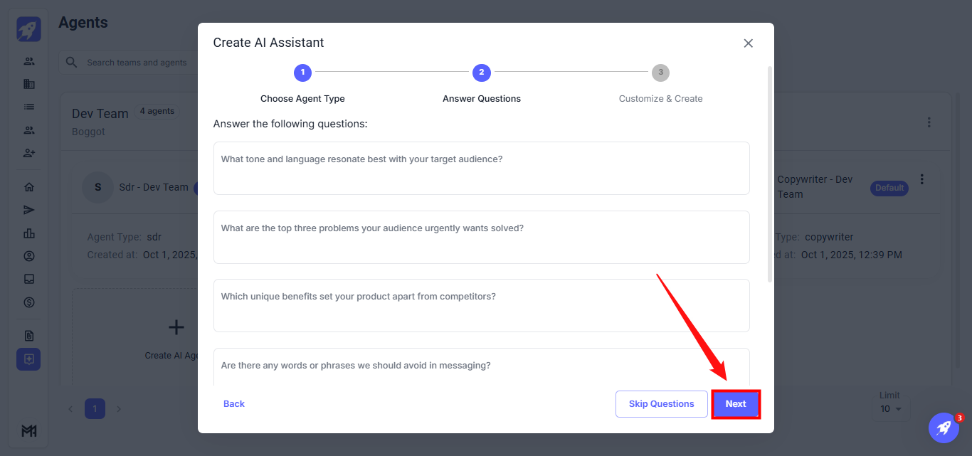 Step 4: Answer any questions related to the selected agent type and then click Next. This step will help further define the agent’s role and functionality.