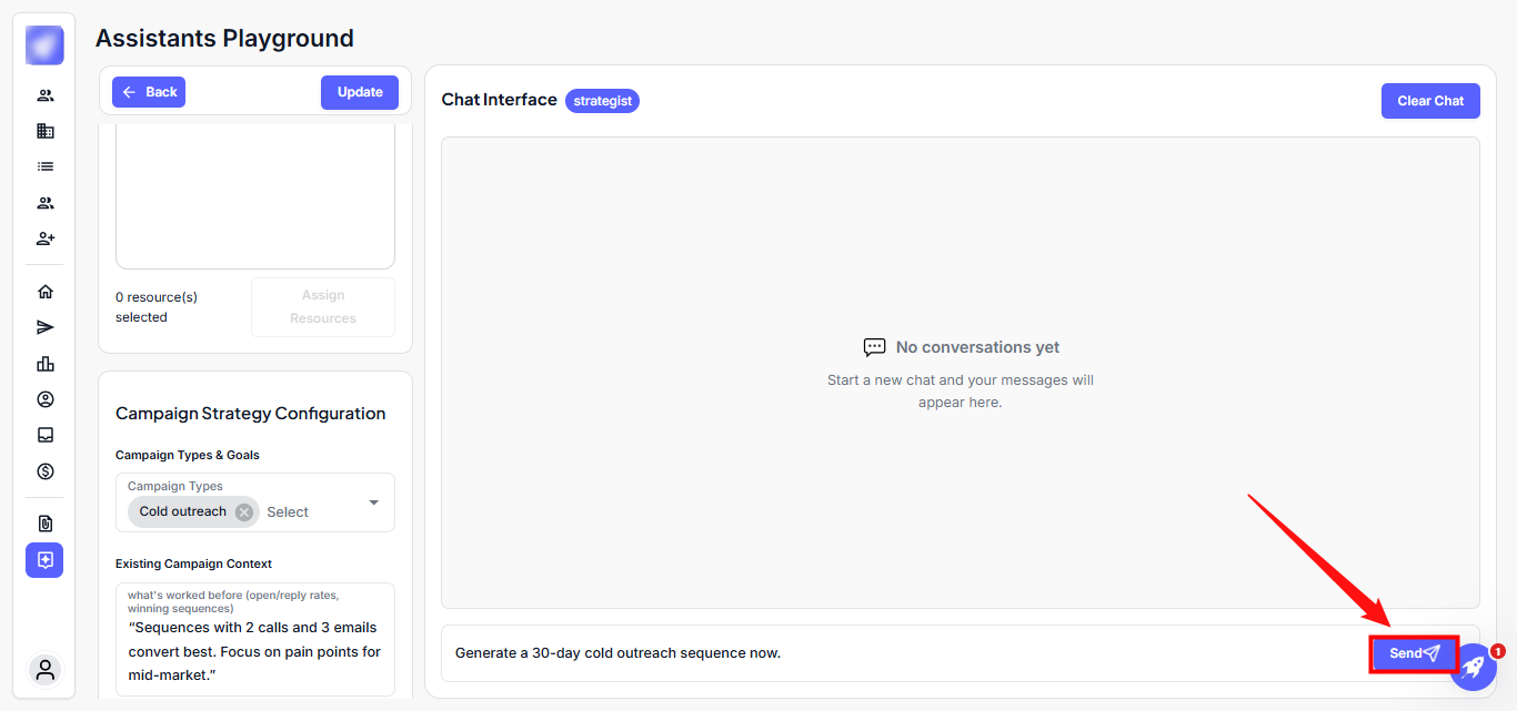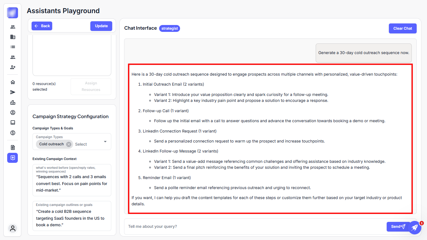Step 3: Type a final query into the chat box, such as, "Generate a 30-day cold outreach sequence now and click Send.