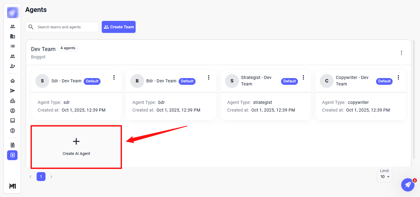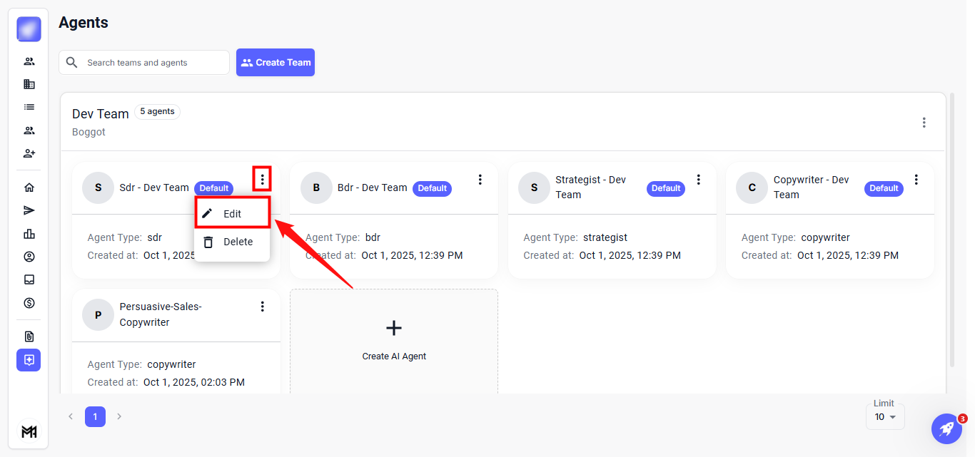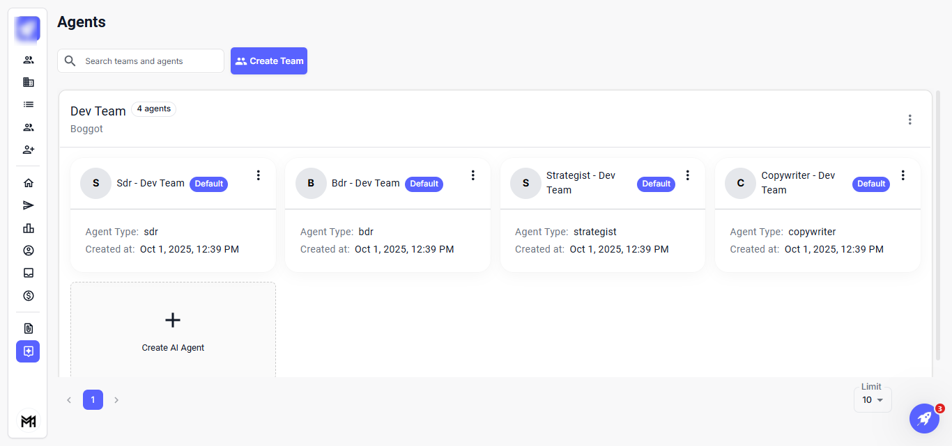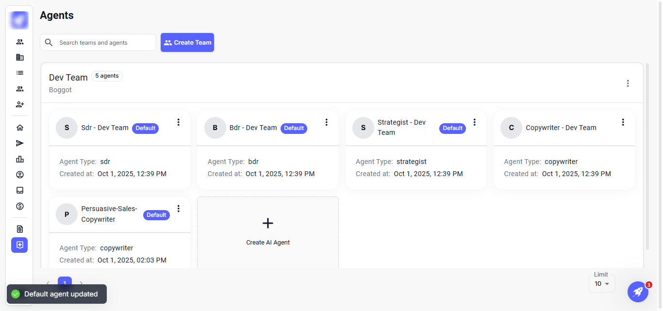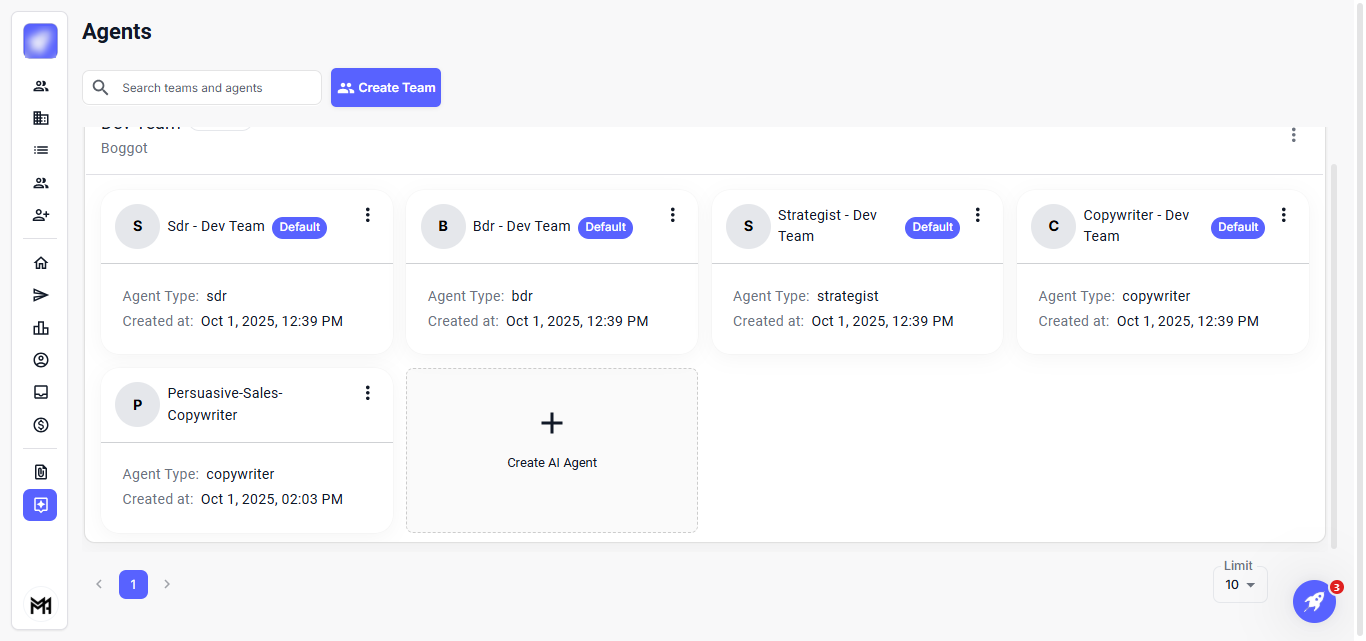 The Agents feature enables efficient management and organization of your AI agents and team members. It allows you to easily create teams, assign agents, and modify their roles and settings, ensuring smooth and coordinated operations.