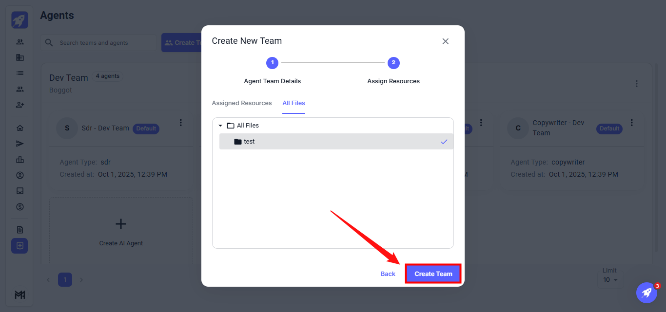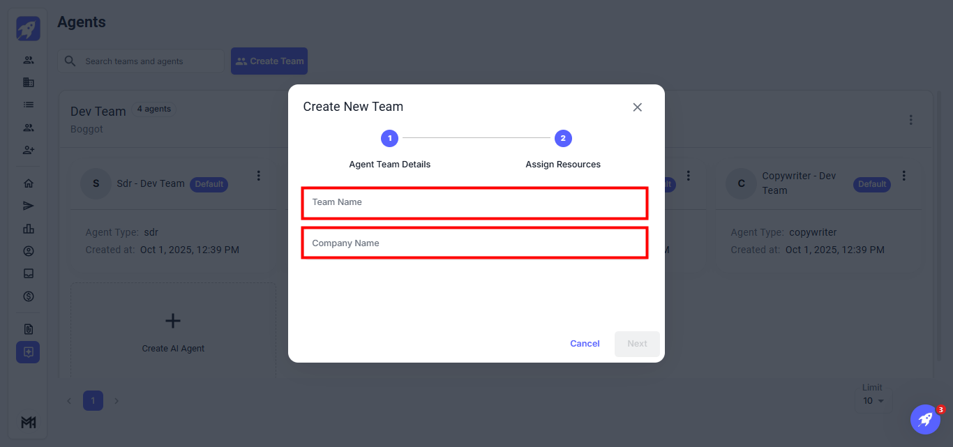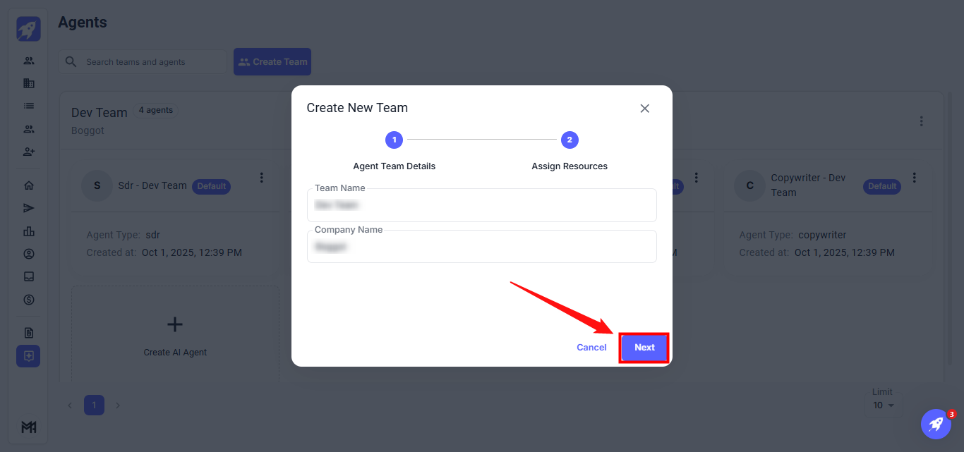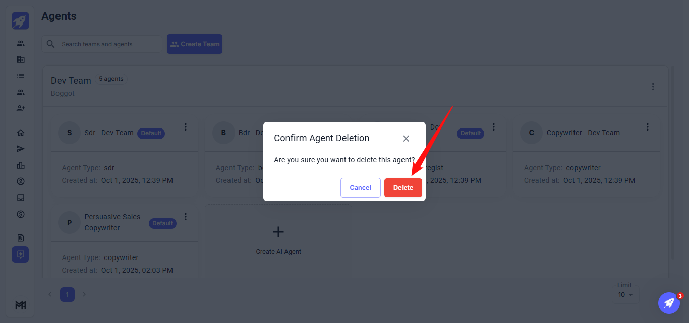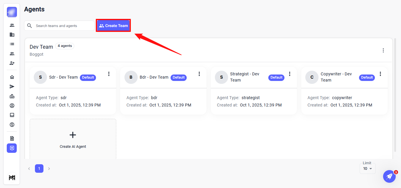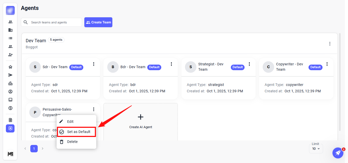 The Agents feature enables efficient management and organization of your AI agents and team members. It allows you to easily create teams, assign agents, and modify their roles and settings, ensuring smooth and coordinated operations.