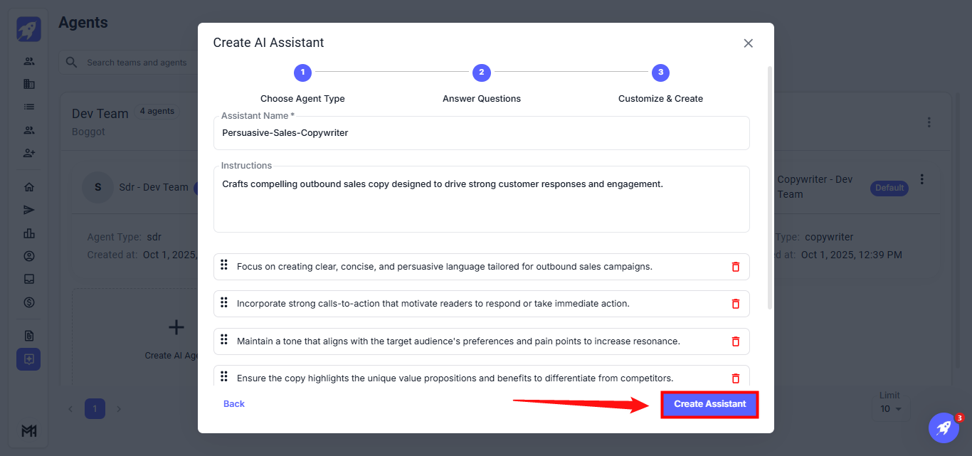 Step 5: Customize the agent settings and click Create Assistant to finalize the agent addition.