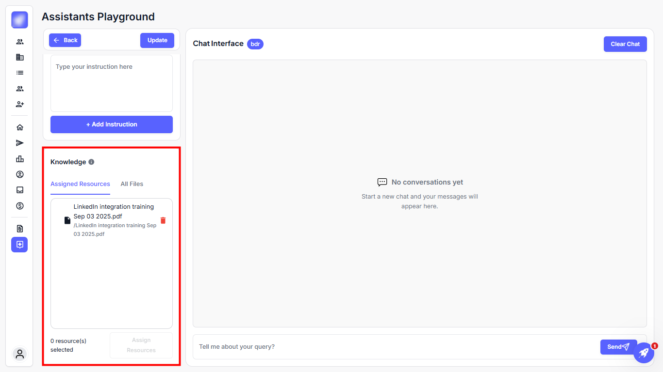 Step 1: Go to the BDR agent and assign resources to upload relevant documents (e.g., training decks, CRM exports, LinkedIn data) that the BDR Agent will analyze to extract prospects.