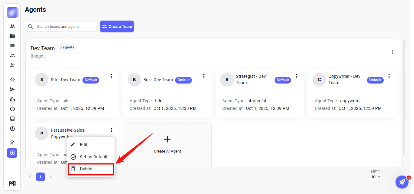 Step 1: Click on the Vertical ellipsis (three dots) next to the agent's name and select Delete from the drop-down options.