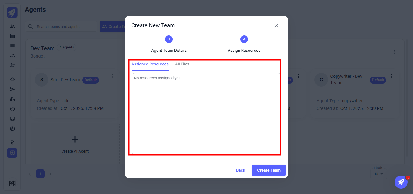 Step 4: Assign relevant resources to the team. This step is optional, and you can either skip it or choose the files to associate with the team.