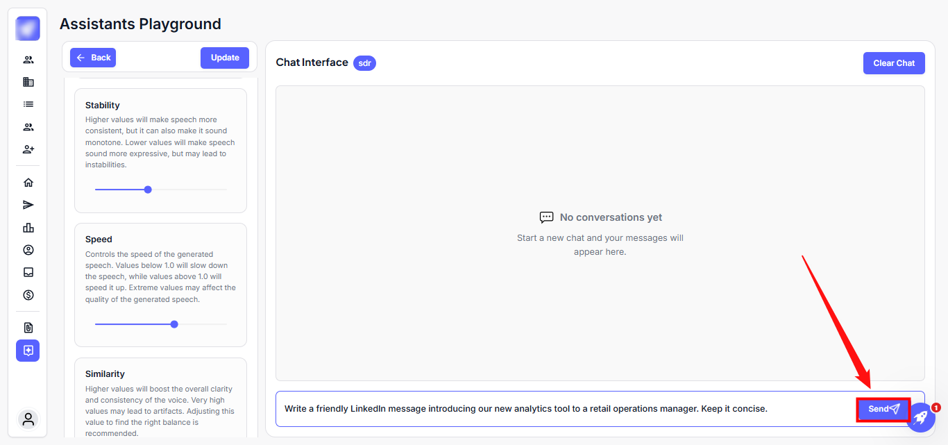 Step 3: Type your outreach goal or prospect info in the chat box and click Send. The SDR Agent drafts your message instantly.