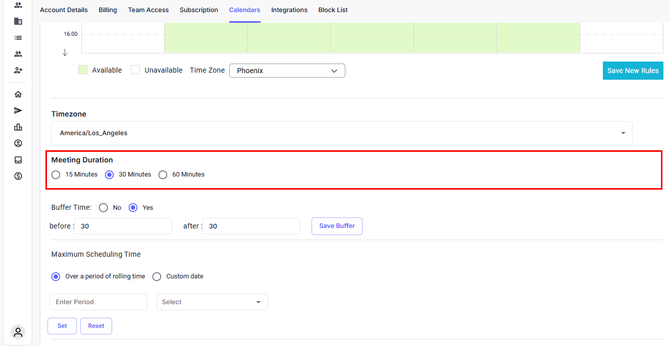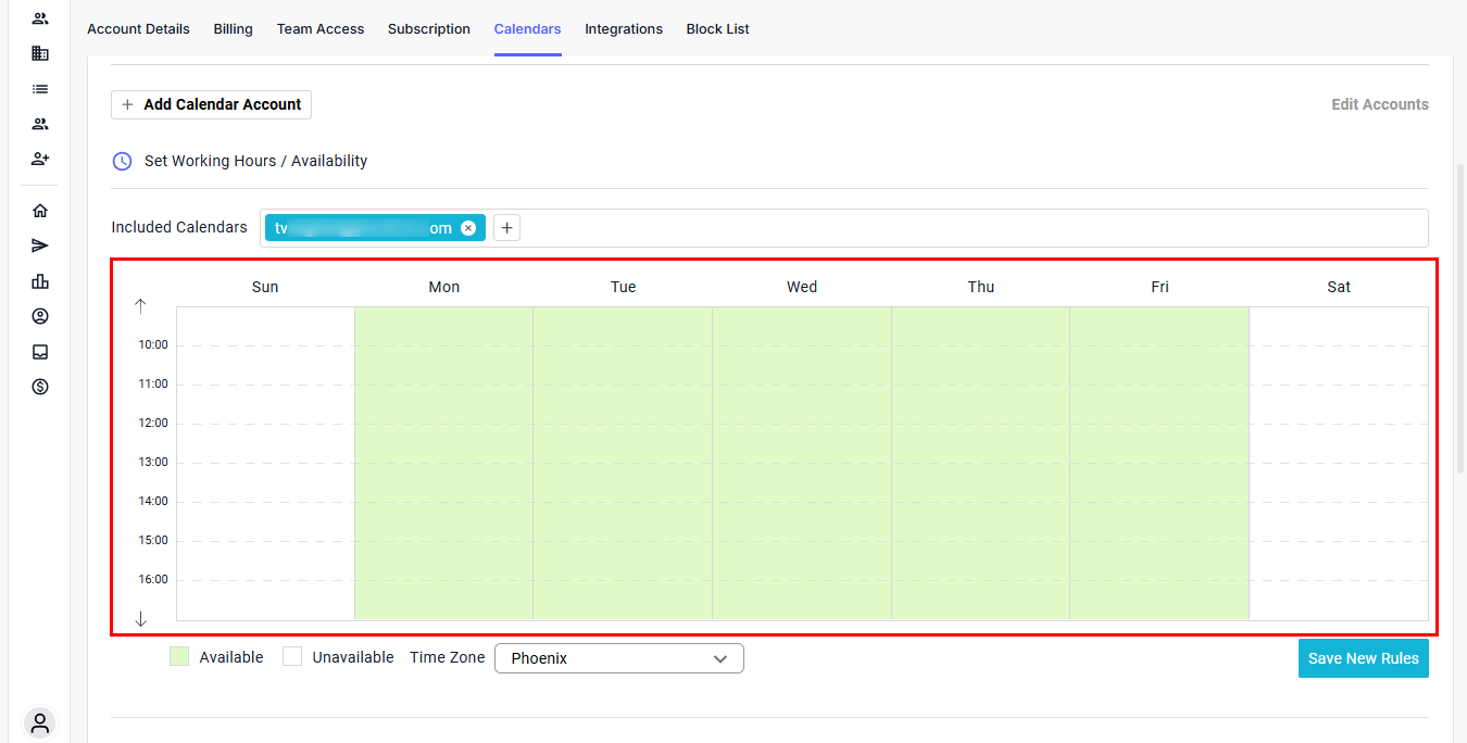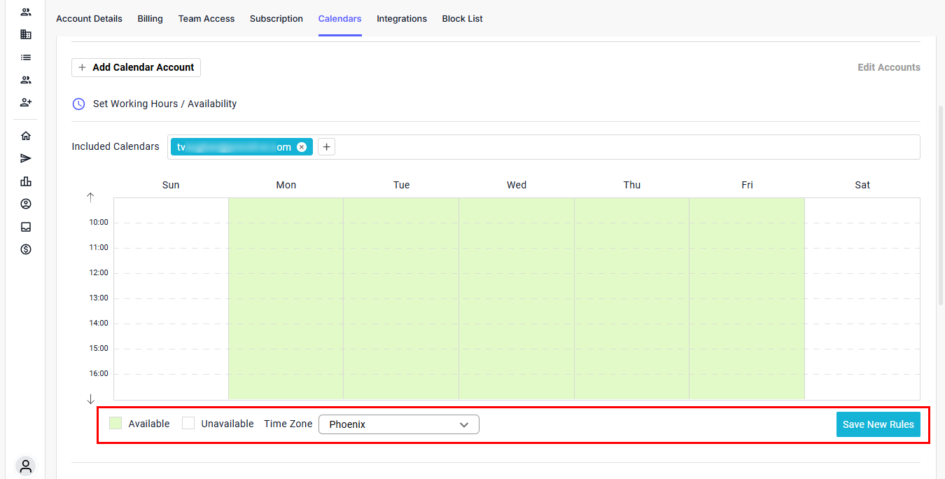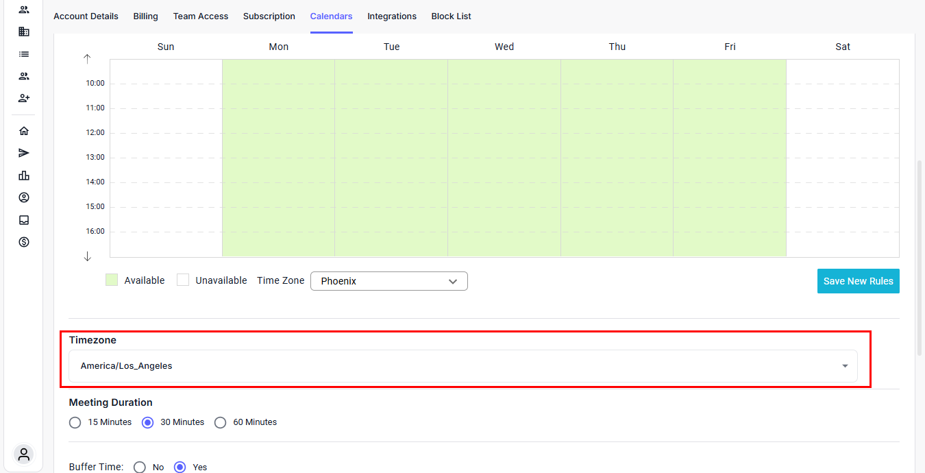 Note: All time blocks and scheduling rules will follow this selected timezone.