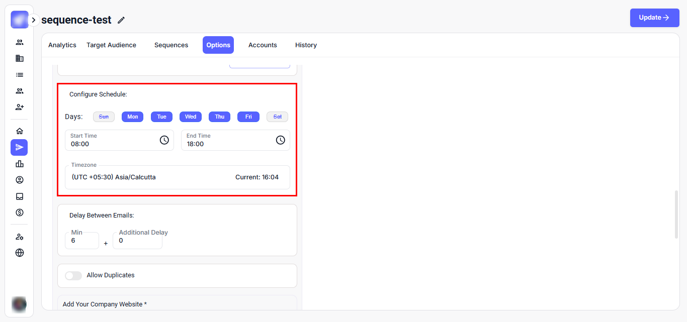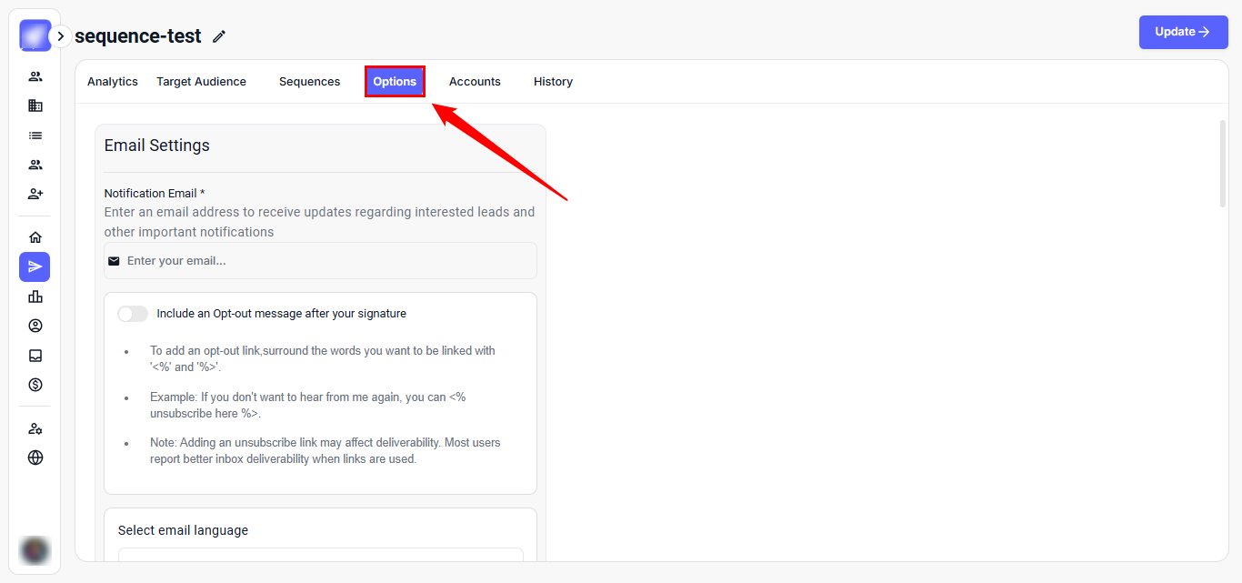 Step 1: Navigate to your campaign and go to the Options tab. This tab allows you to control scheduling and timing.