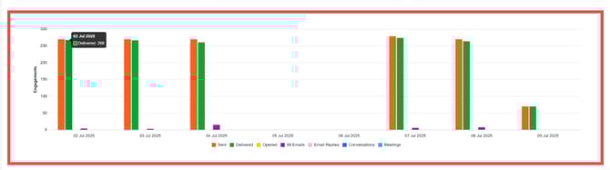 The graph offers a visual breakdown of your campaign’s outreach activity over time, with color-coded bars representing different metrics such as emails sent, opened, or clicked.
