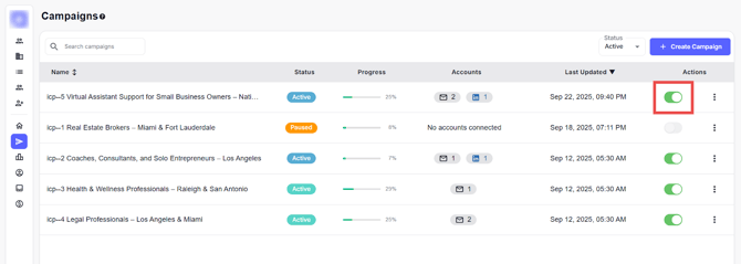 Step 1: From the Campaigns page, check the toggle button next to your campaign. If the toggle is enabled, the campaign is active, and emails will be sent as scheduled.