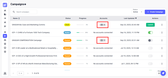 Here, you can view all the accounts connected to the campaign.