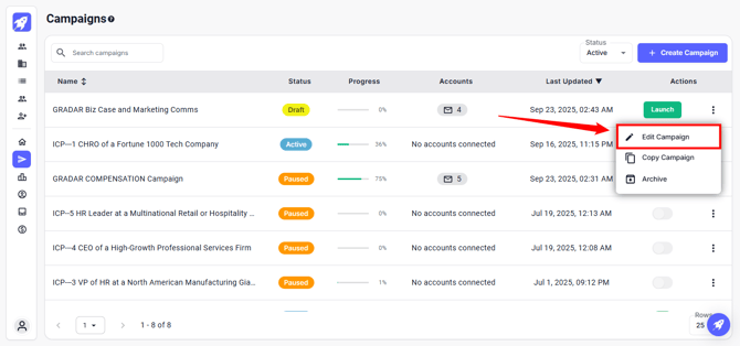 Edit Campaign: Opens a modal to modify the existing campaign or start a new one.