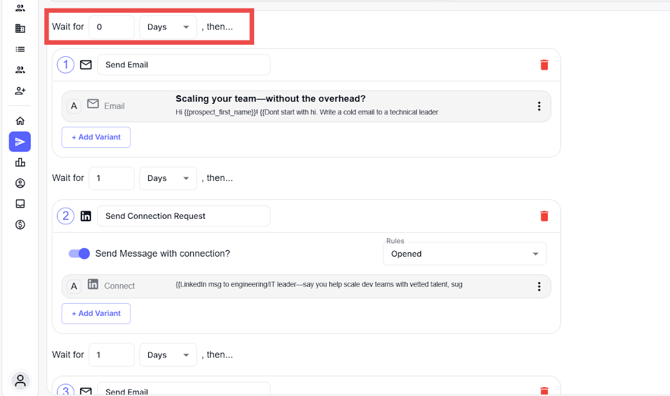 By default, the first step in a sequence is delayed by 3 days. Setting this to 0 is necessary for same-day sending to ensure your campaign starts immediately.
