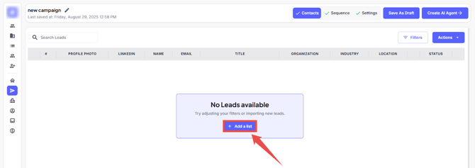 Step 5: Click Add Leads to begin adding contacts to your campaign.