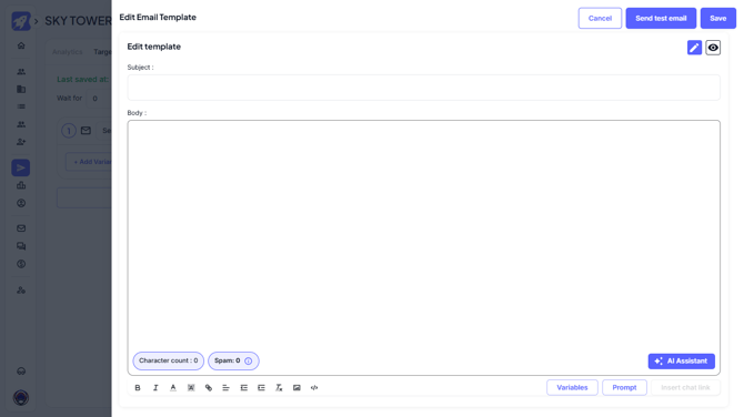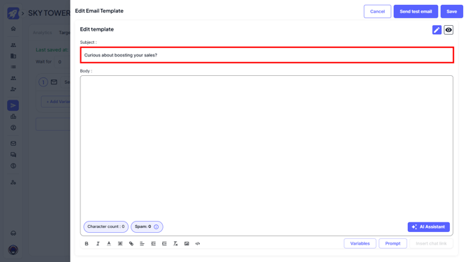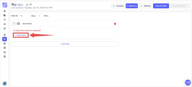 Step 12: Click on the + Add variant button to open the email editor, where you can begin writing or generating your cold email.