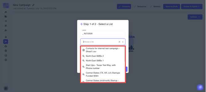 Step 6: A modal window will appear. Click the dropdown arrow under Choose a List, then select the list you want to add to the campaign.