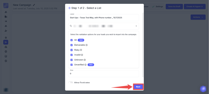 Step 7: After selecting a list, a new window will appear. Choose the lead types to include, check Allow Duplicates if needed, then click Next.