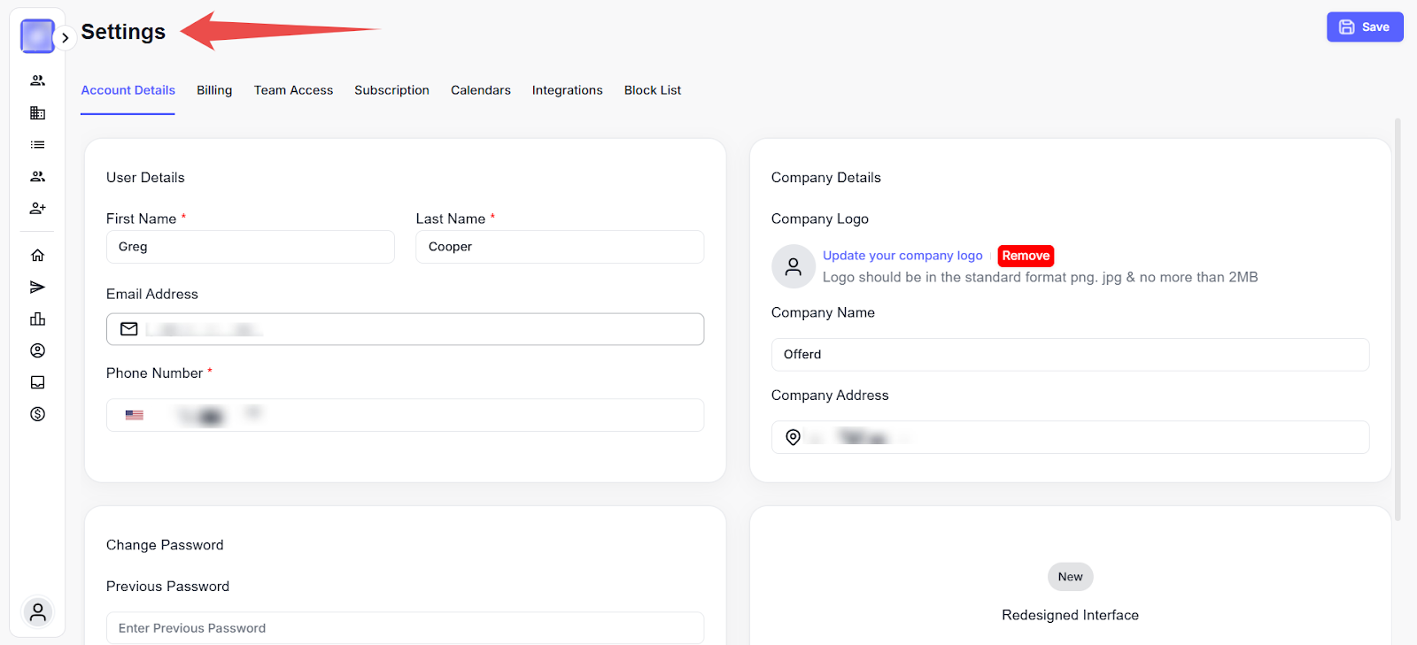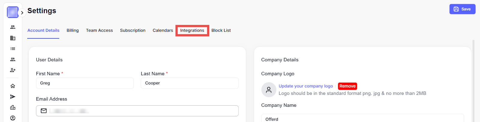 You’re now on the Integrations page, where you can connect CRMs, marketing platforms, and website tracking.