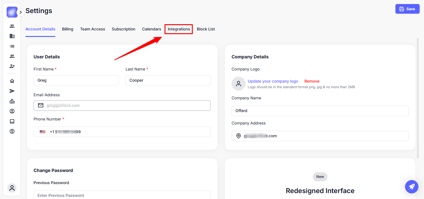 You’re now on the Integrations page, where you can connect CRMs, marketing platforms, and website tracking.