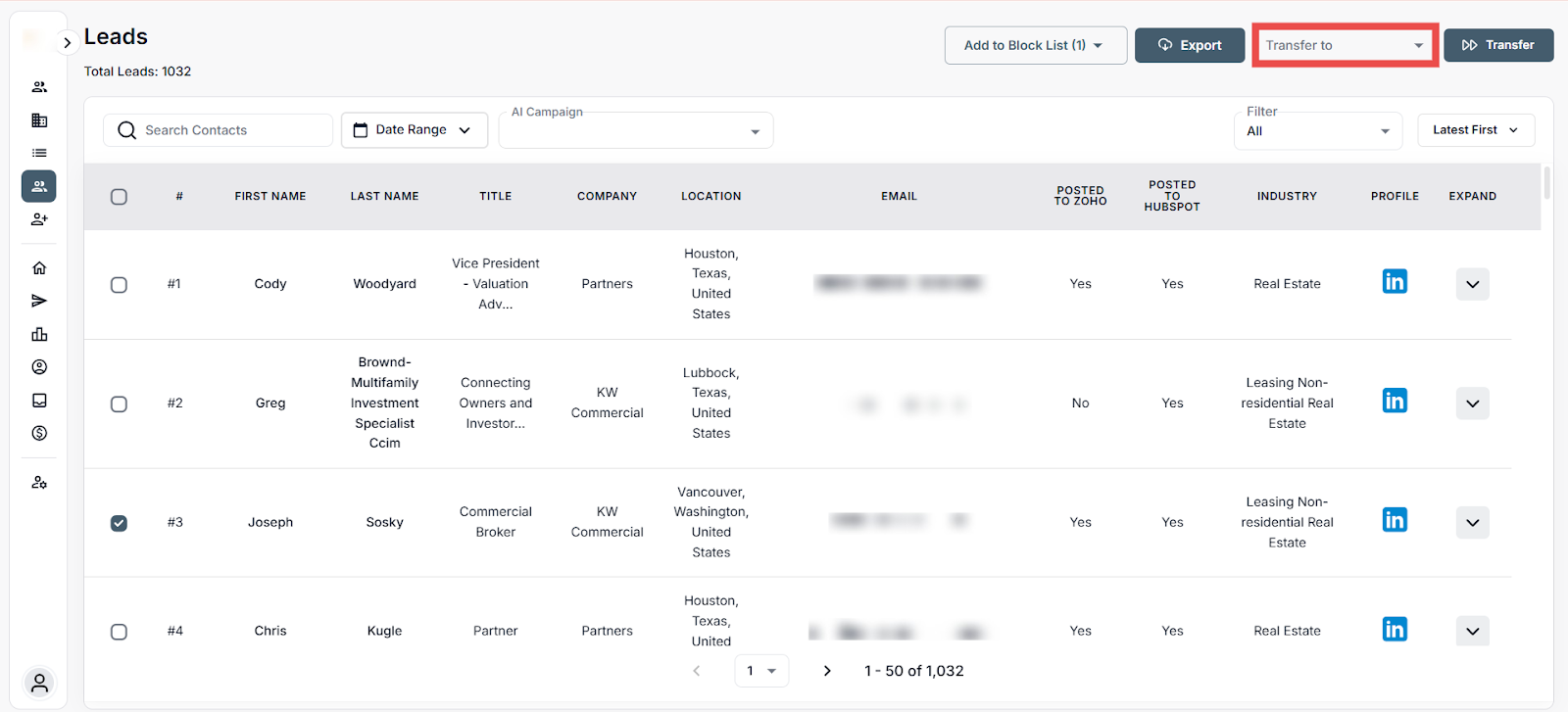 Step 3: Click on the Transfer To drop-down menu at the top right corner to view various lead transfer options.