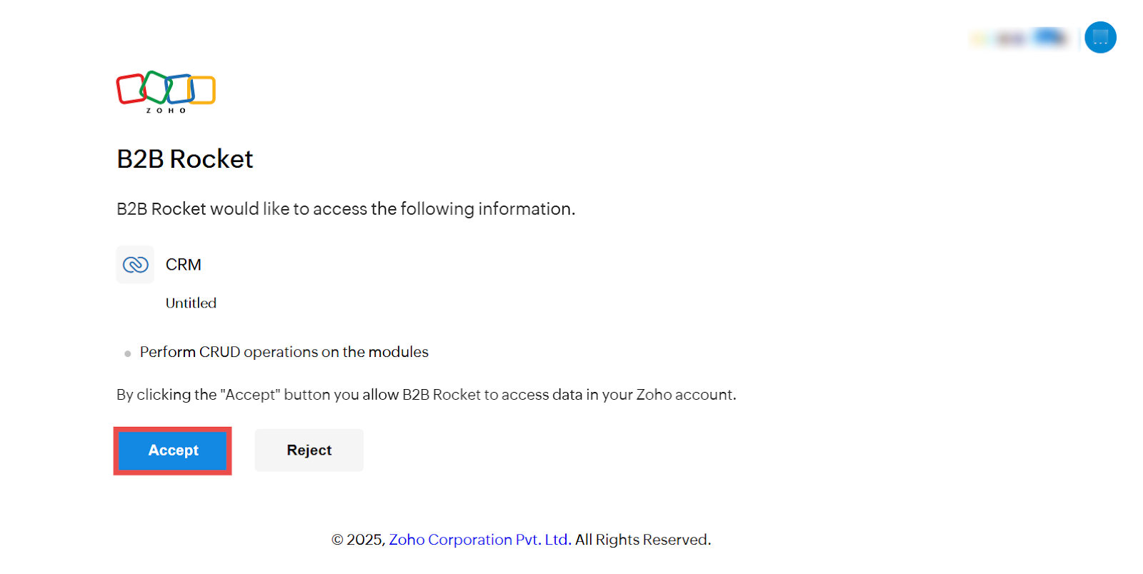 Step 3: Click on the Accept button to allow Zoho to access your data.