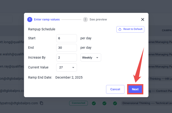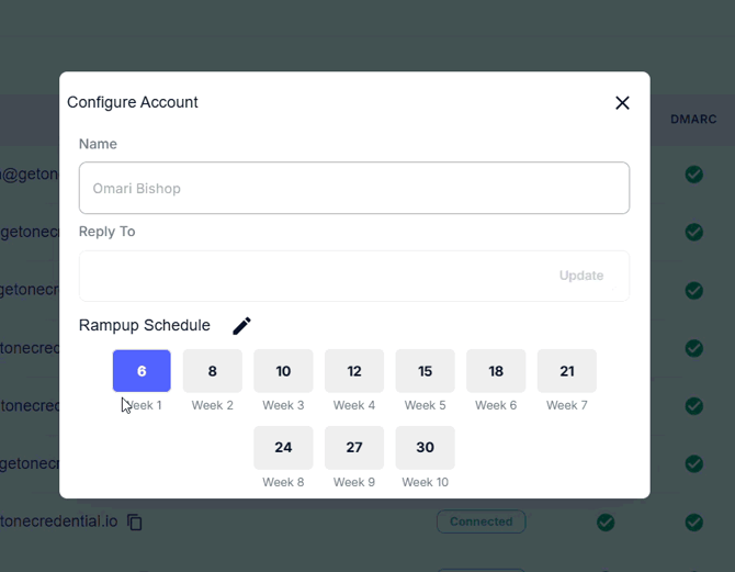 You can customize your ramp-up schedule to control how your email volume increases while keeping your domain safe. This feature lets you adjust the weekly sending limits to suit your business needs, ensuring steady growth in your email outreach.