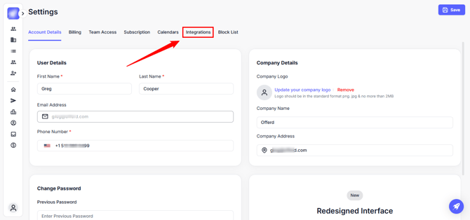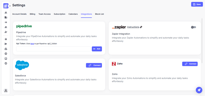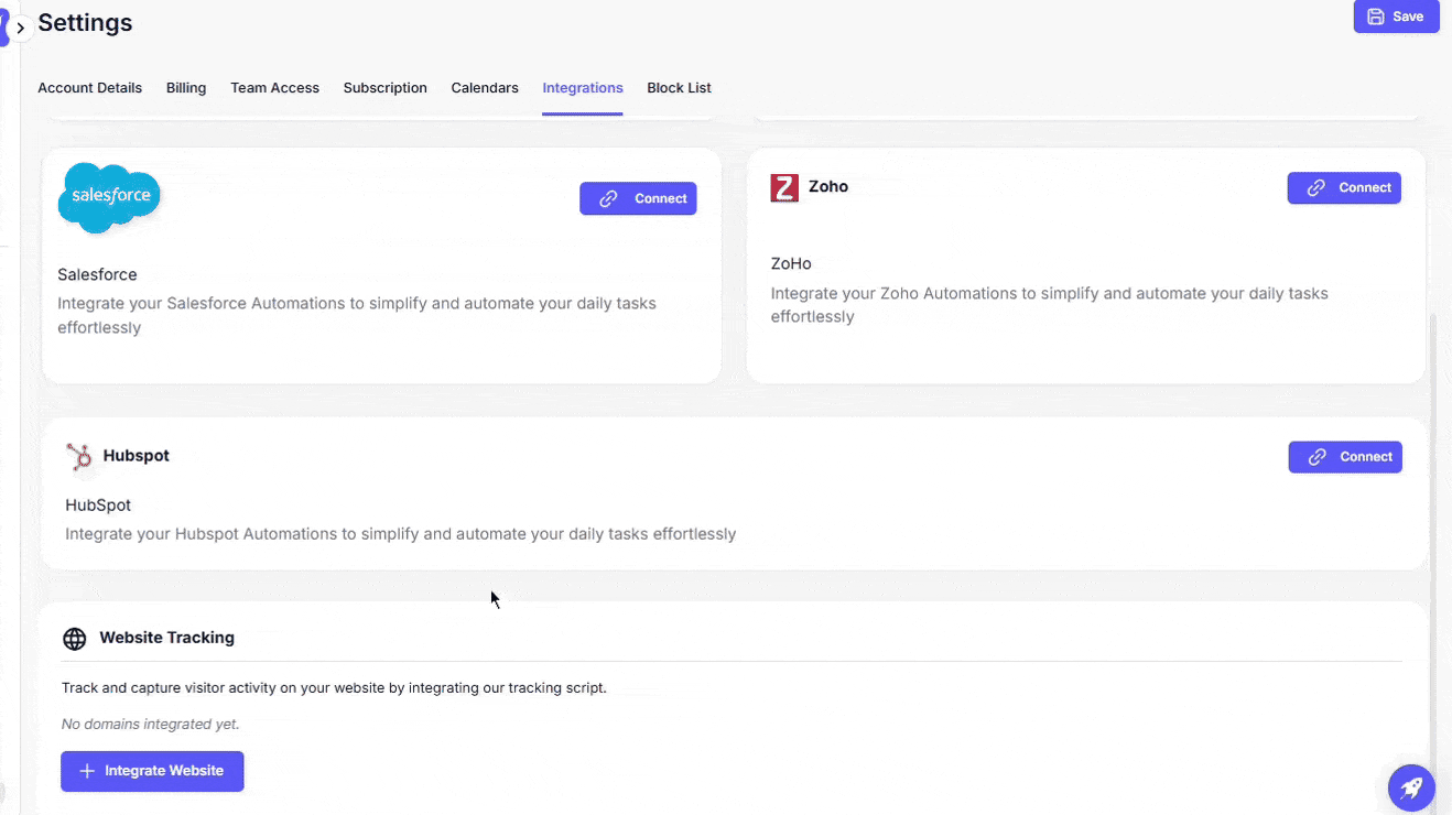 Whether you want to automatically push new leads from outreach campaigns into your CRM, assign ownership dynamically, or capture traffic insights from your website, everything starts with the Integrations panel.
