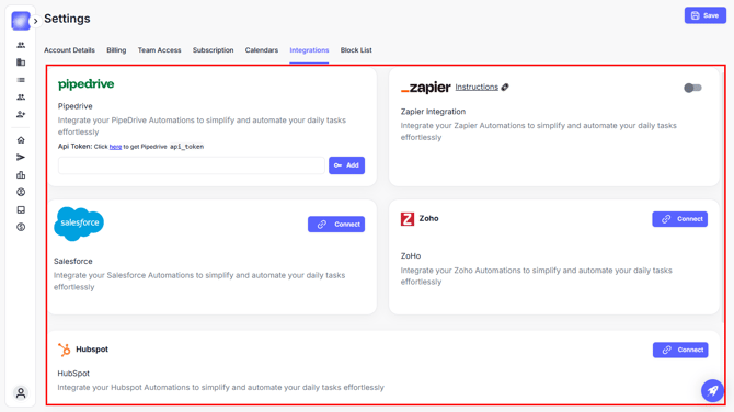 Integrations are the backbone of automation inside your workspace. By connecting your CRM platforms (like Pipedrive, Salesforce, or HubSpot) and enabling website tracking, you ensure leads flow seamlessly, tasks are automated, and your agents work smarter, not harder.