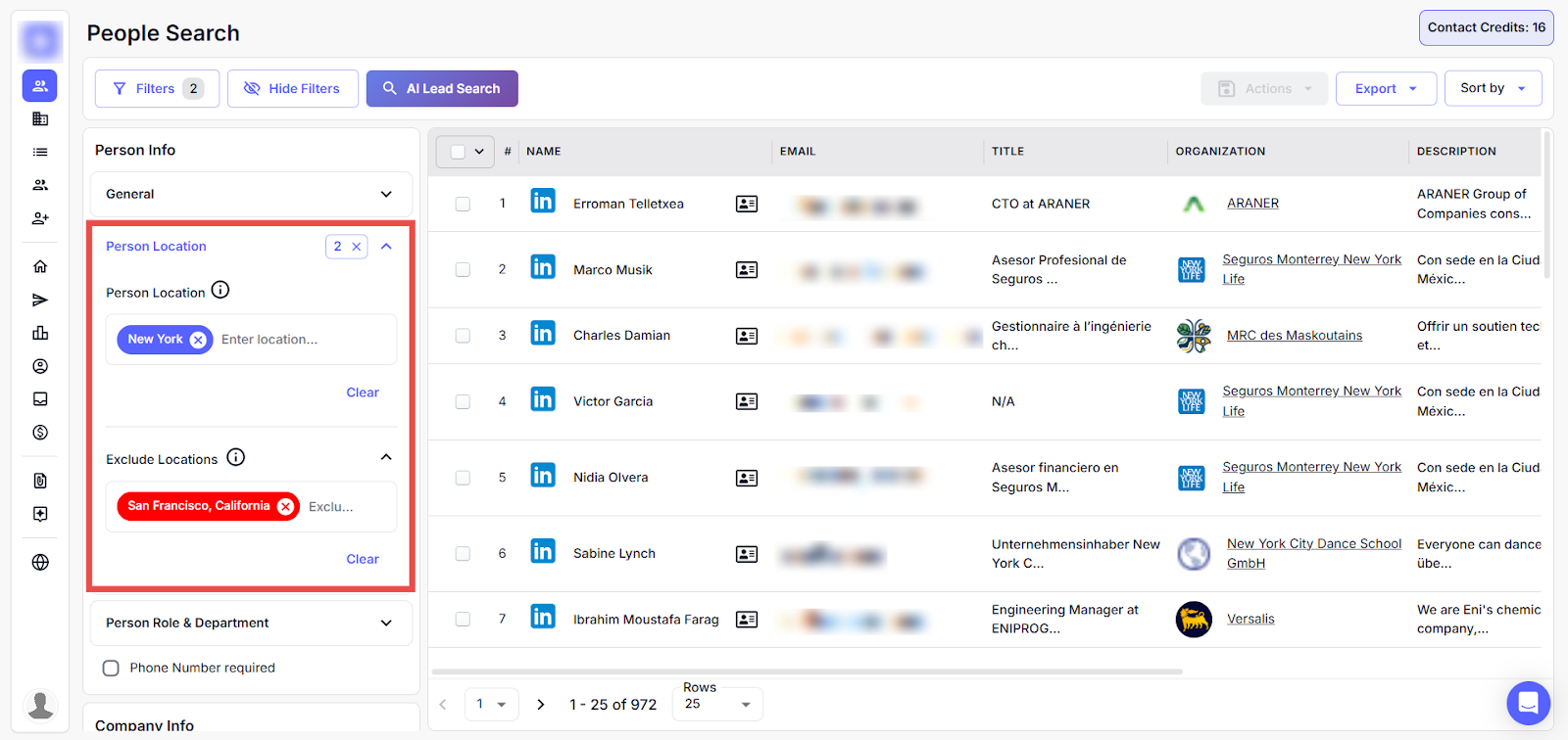 For example: Filter people located in "New York" while excluding those from "Dallas" using the location fields.