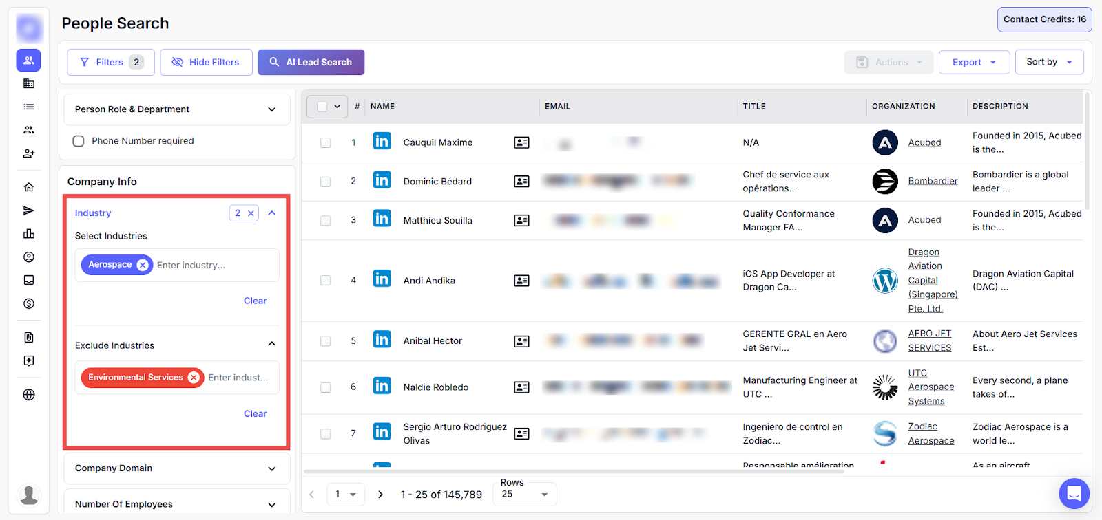 For example: Filter people working in the "Automotive" industry while excluding those from the "Food and beverage" industry using the industry fields.