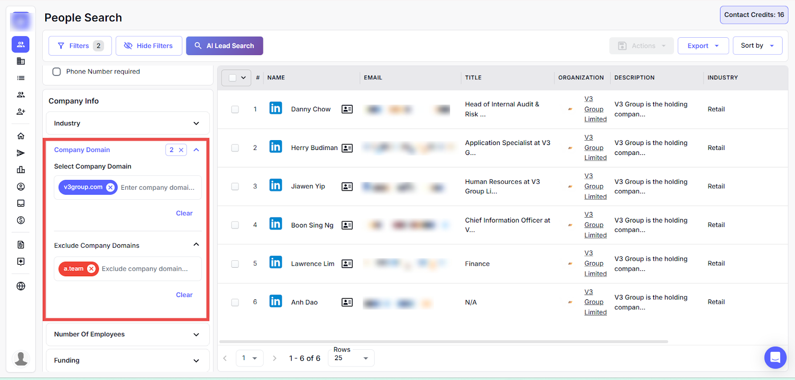 This enables users to filter people by their specific company domain or exclude certain company domains from the search results to refine the search.