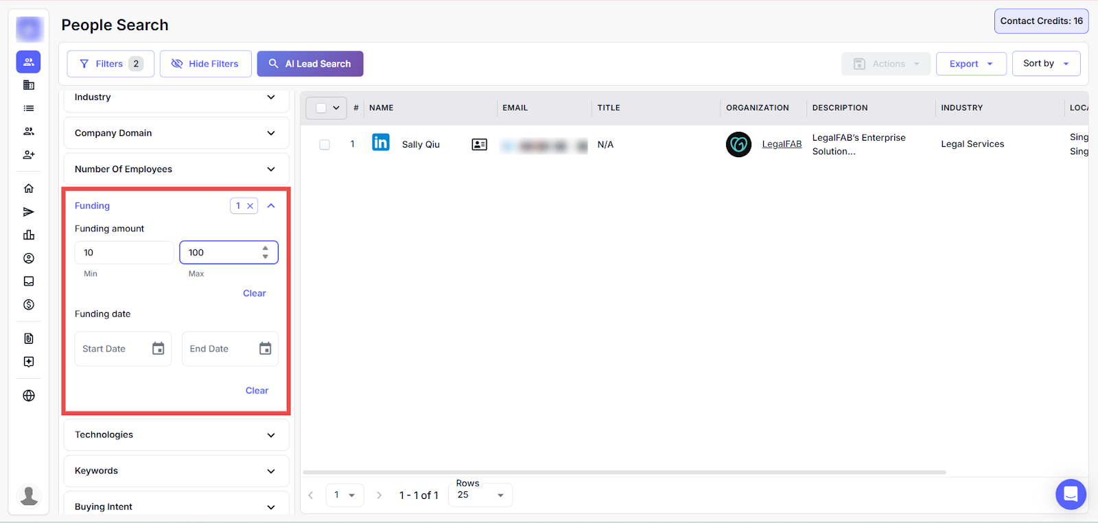 For example: Filter companies with funding between "$100" and "$50,000" from January 1, 2020, to December 31, 2020, using the funding amount and date fields.