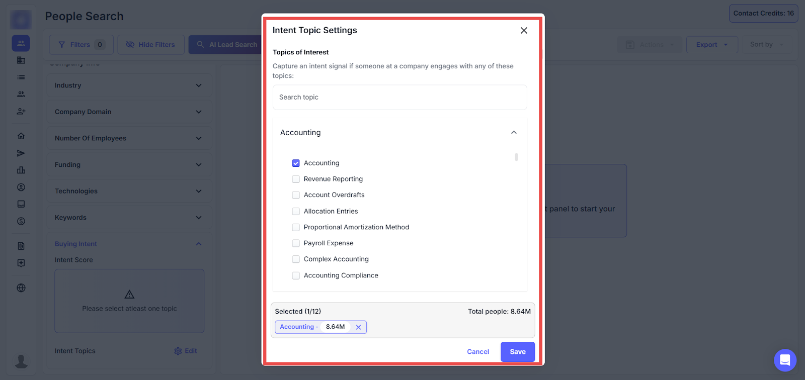 For example: Select at least one buying intent topic by clicking "Edit" to refine search results based on specific intent topics like “SpaceX from Aerospace”.