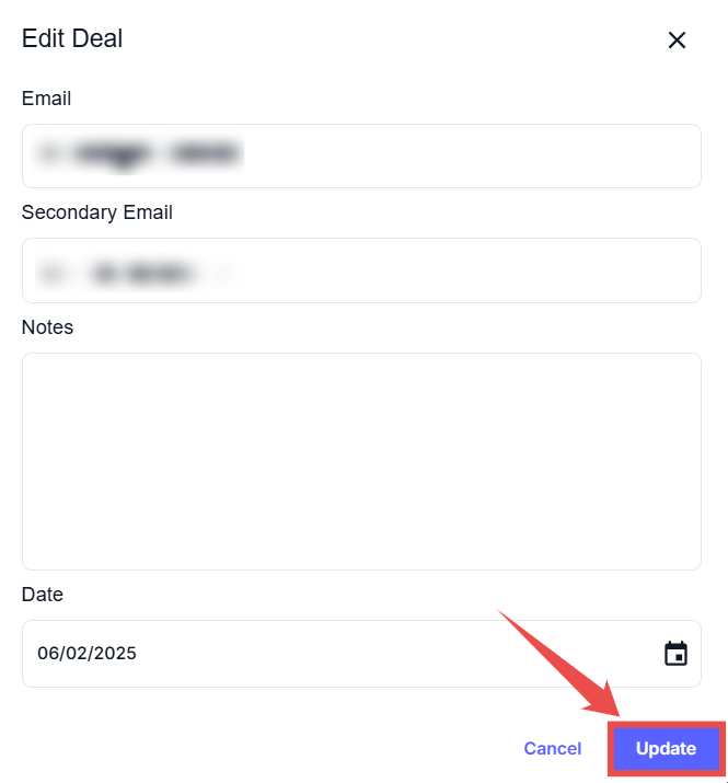Step 3: A modal window will appear with the deal’s existing details—make the necessary changes (e.g., email, notes, or date), then click Update to save.