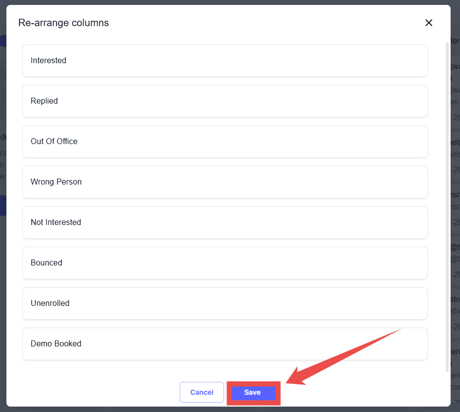 Step 4: A modal window will appear. Drag and drop the column names to reorder them, then click Save.