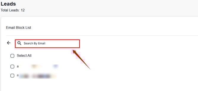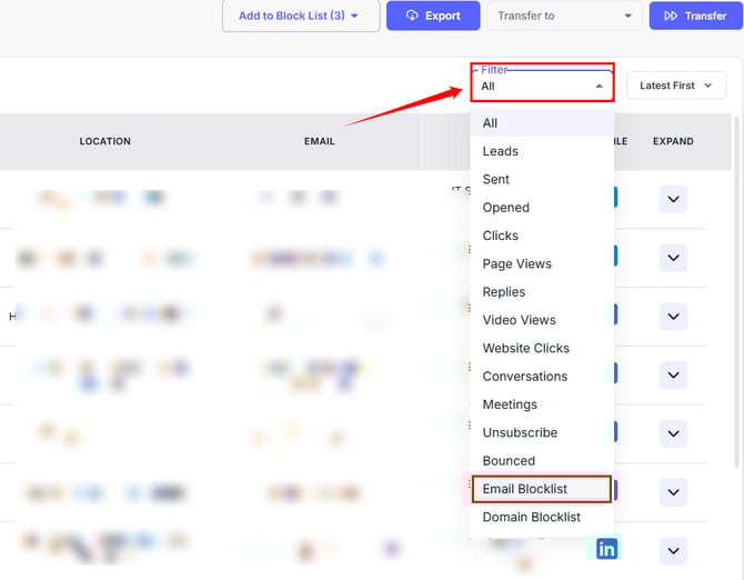 Step 2: You will navigate to the leads dashboard, click on the Filter, and select Email Blocklist to view all the blocked email addresses.