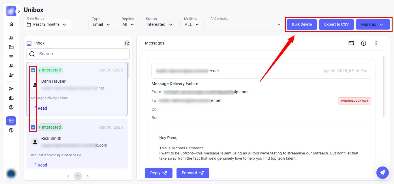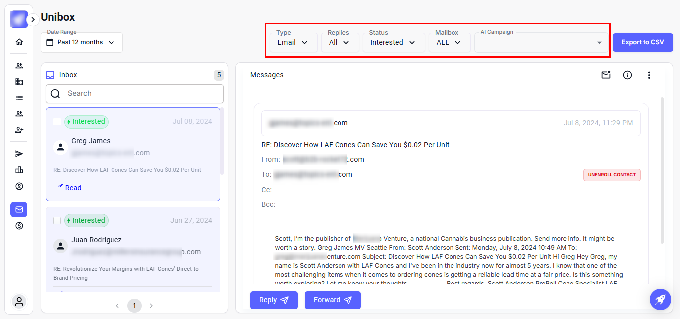Managing your inbox helps you focus on the most relevant replies by using filters and export tools built into the top navigation bar. From sorting leads by interest level to isolating campaign-specific responses, the Manage Inbox view is designed to save time and boost your reply efficiency.