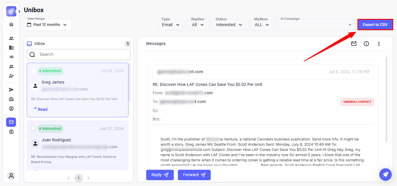 Click the Export to CSV button (top right) to download the filtered inbox data as a spreadsheet. This is useful for sharing with your team or importing into a CRM.