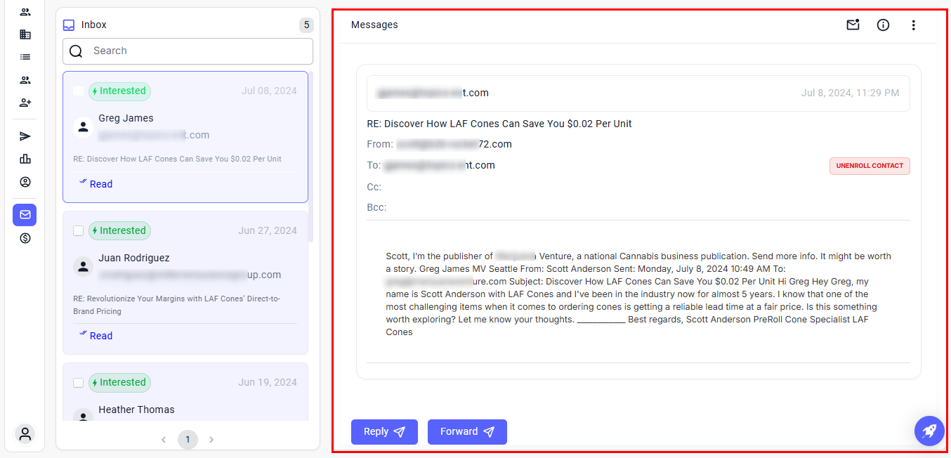 Click any reply to view full details and take actions like Reply, Forward, or Unenroll — plus mark as unread or view contact info.