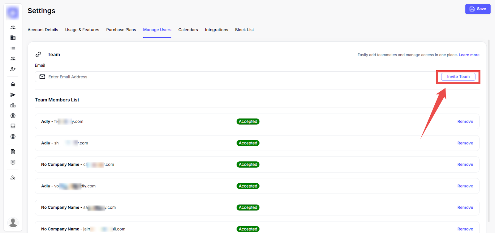 Step 2: Once entered, click the Invite Team button to send the invitation.