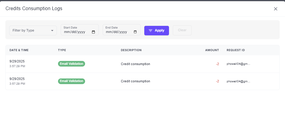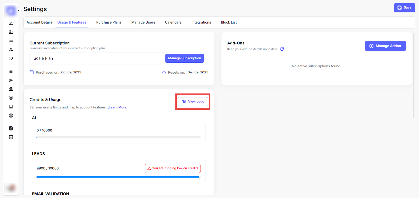 A new Logs button is available in the Usage & Features tab, allowing users to view detailed records of credit consumption and feature usage. Filters and search options make it easier to audit activity across AI, email, and contact-related features.