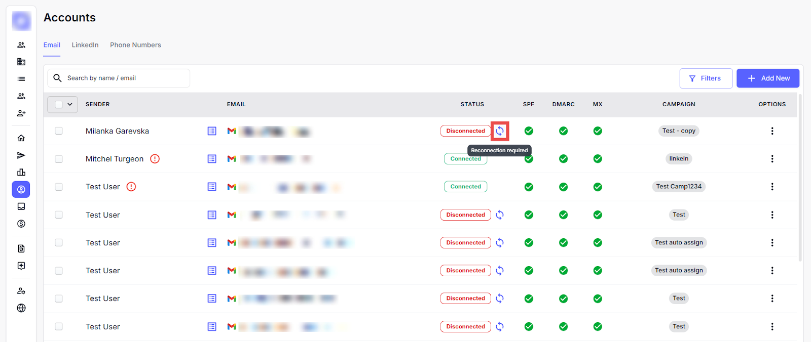 A new Reconnect button lets users quickly restore disconnected mailboxes directly from the Email Accounts page. Once reconnected, mailbox status updates automatically across all relevant views.