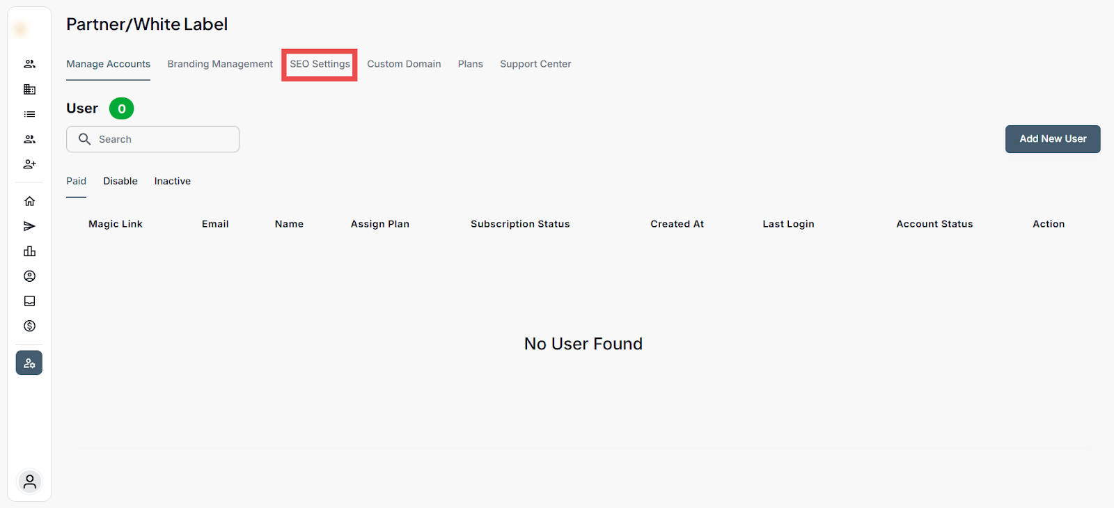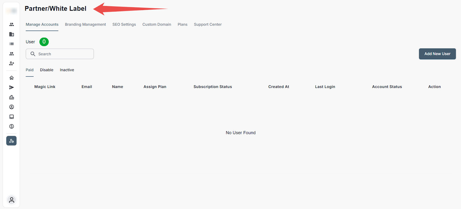 Step 1: Log in to your account and click the White Label icon on the Left-hand sidebar.