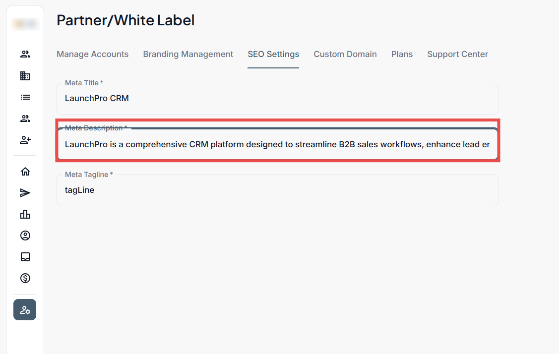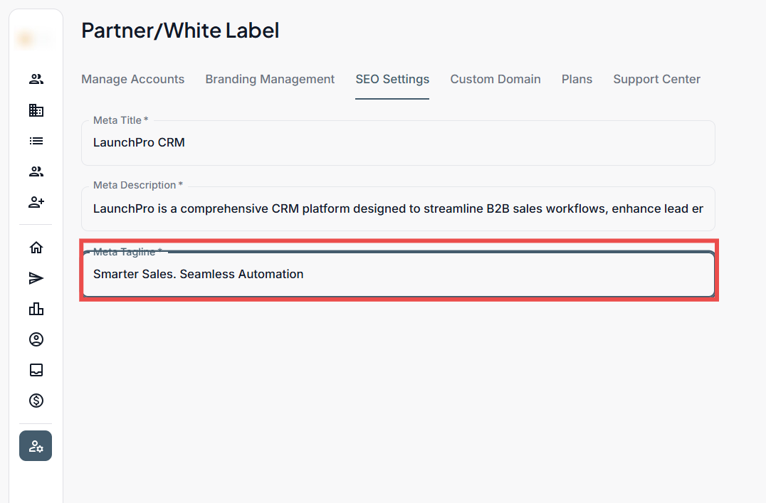 The SEO Settings section allows you to define key metadata for your white labeled platform, which helps search engines like Google, Bing, etc, understand and index your site correctly. This is particularly important when you’ve set up a custom domain and want your branded platform to appear in search results with the right title, description, and tagline.